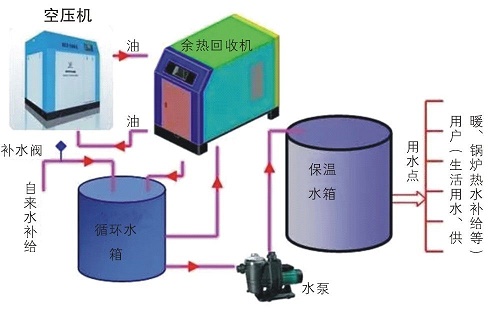 螺桿空壓機(jī)熱水機(jī)組是一種利用壓縮機(jī)高溫油氣熱能,通過熱交換將熱能充分利用的節(jié)能設(shè)備。它通過能量交換和節(jié)能控制,收集螺桿空壓機(jī)運(yùn)行過程中產(chǎn)生的熱能,同時改善空壓機(jī)的運(yùn)行工況,是一種相對高效廢熱利用、零成本運(yùn)行的節(jié)能設(shè)備。