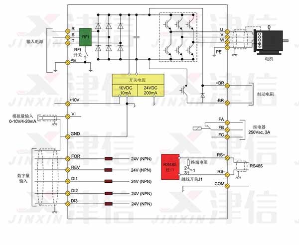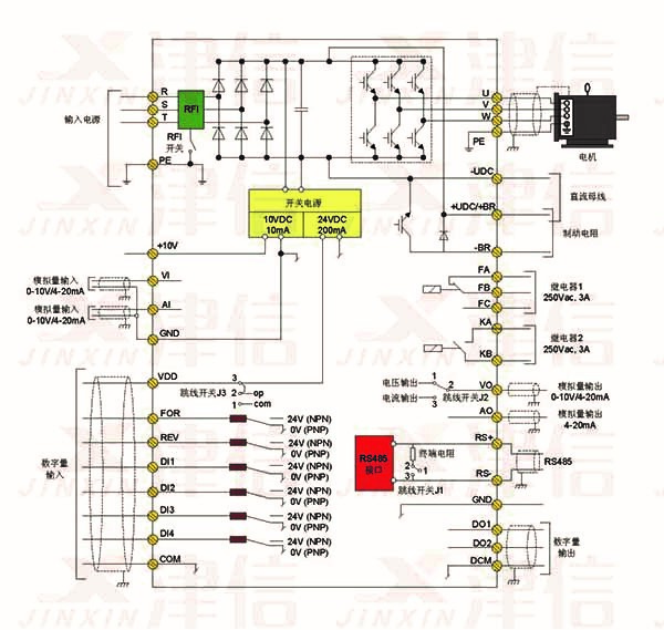 海利普變頻器主要由整流、濾波、逆變、驅動單元、制動單元、檢測單元微處理單元等組成。采用交-直-交工作原理,首先將三相交流電經整流模塊變換成直流,再進行濾波后,通過IGBT等其它電力電子器件逆變成頻率和電壓均可變的三相交流電供電機使用。同時,通過IGBT的開斷調整輸出電源的頻率和電壓,從而達到調速、節能的作用。以下是海利普各系列變頻器的接線示意圖。
